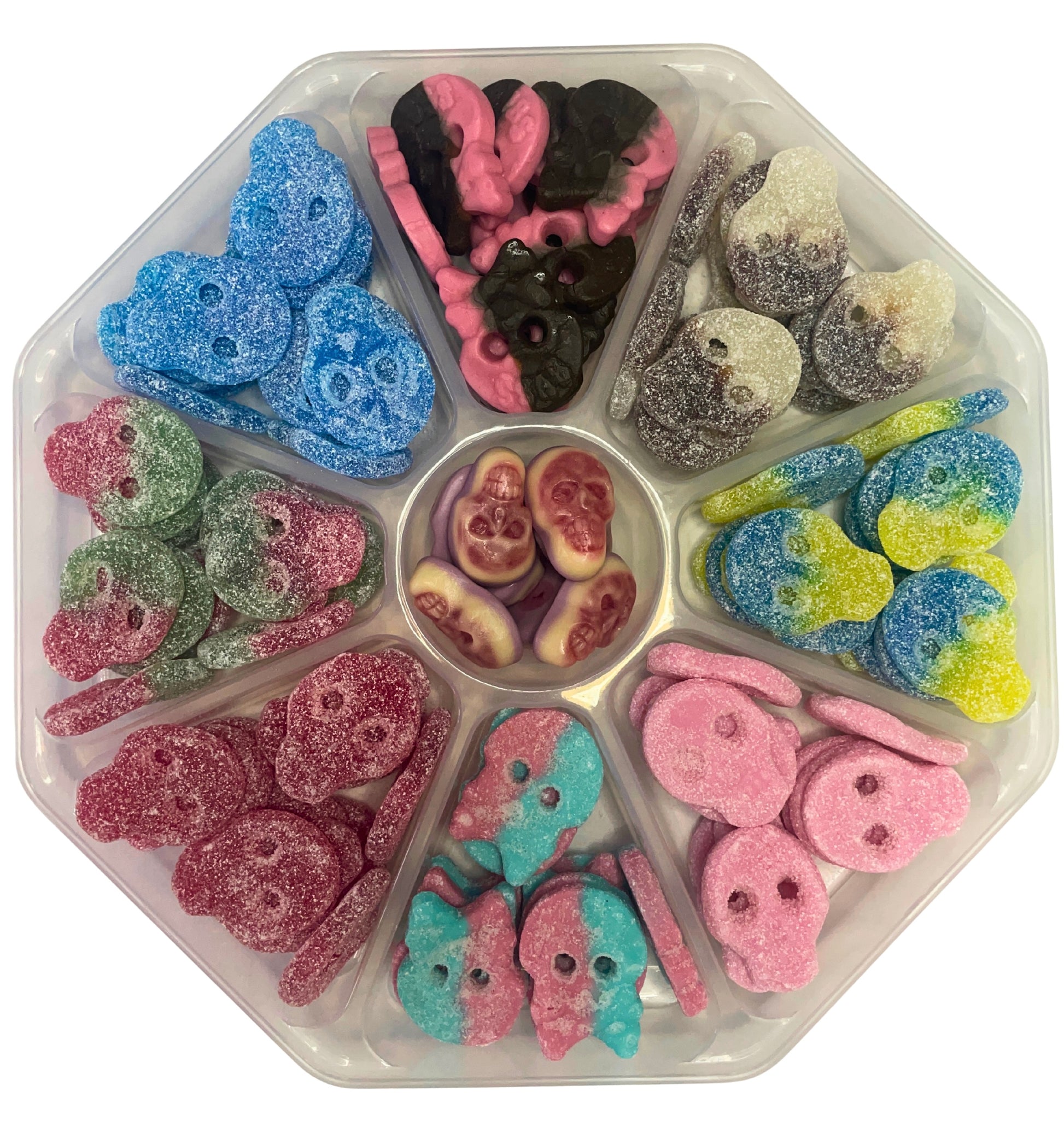 Packed into a handy segmented platter, this mix brings together a variety of textures and tastes, from soft and chewy gummies to fizzy, sugar-coated classics. Each section is carefully filled to give you a little bit of everything, making it ideal for parties, movie nights, birthdays, or sweet tables.